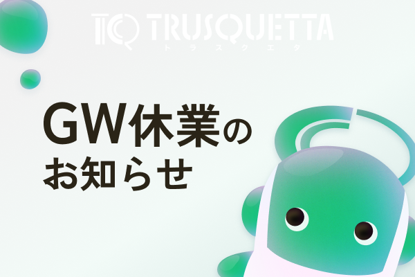 TOP > お知らせ > Uncategorized > ゴールデンウィーク休業のお知らせお知らせゴールデンウィーク休業のお知らせ 2026.04.01 平素は格別のご高配を賜り、誠にありがとうございます。 株式会社トラスクエタは、誠に勝手ながらゴールデンウィーク期間中下記日程で休業とさせていただきます。休業期間: 2026年 5月2日(土)〜5月6日(水)ご不便をおかけいたしますが、何卒ご了承いただきますようお願い申し上げます。 ※休業期間中にいただいたお問合せにつきましては、営業開始日以降に順次回答させていただきます。
