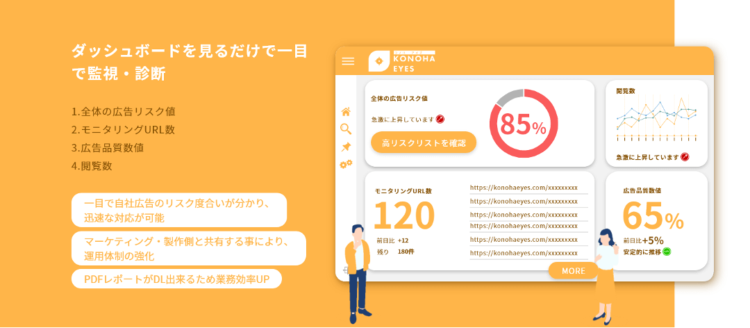 さらに、広告のチェックだけでなく、配信した広告の管理を行い、リスクの高い広告を簡単に確認できたり、AIが自動で広告の監視・診断を行うことが可能となります。