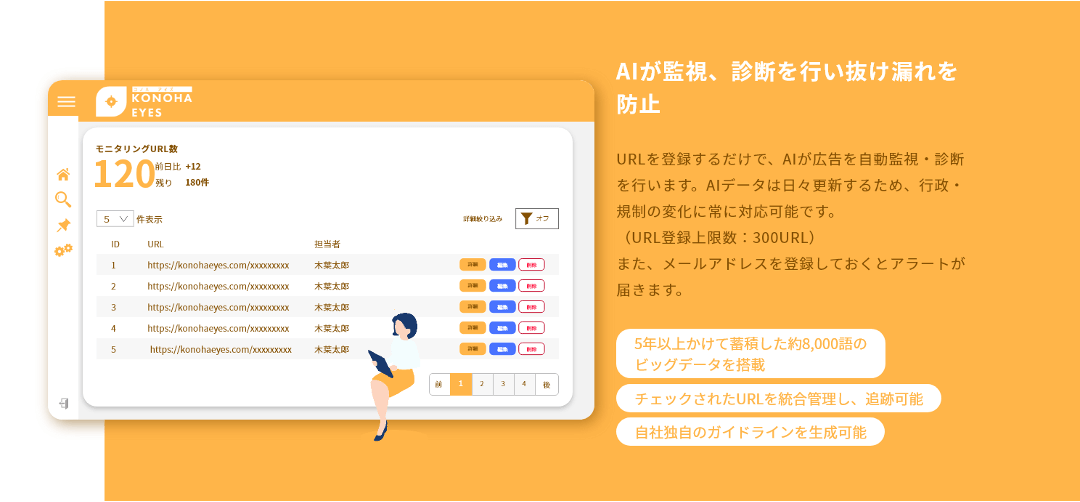 『KONOHA EYES』は2019年に特許を取得した『ツクヨミ』のビックデータを活用し、配信された広告表現のチェックを自動で行うことが可能となります。